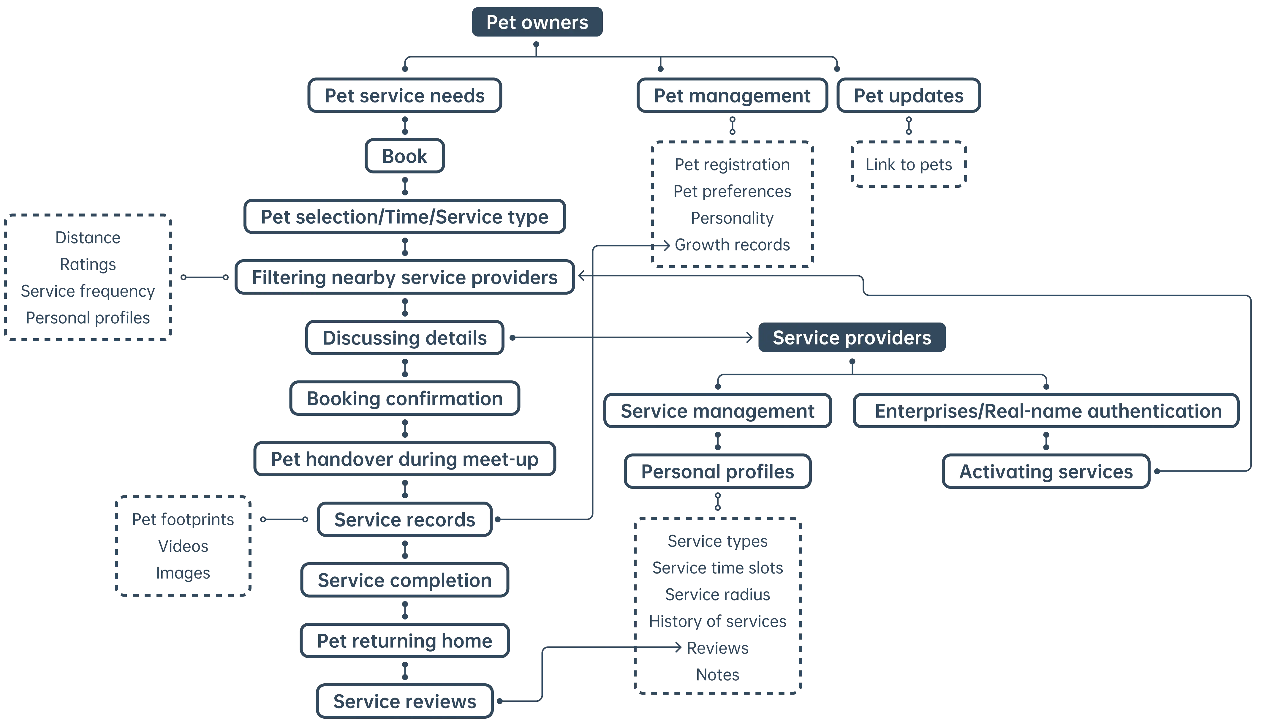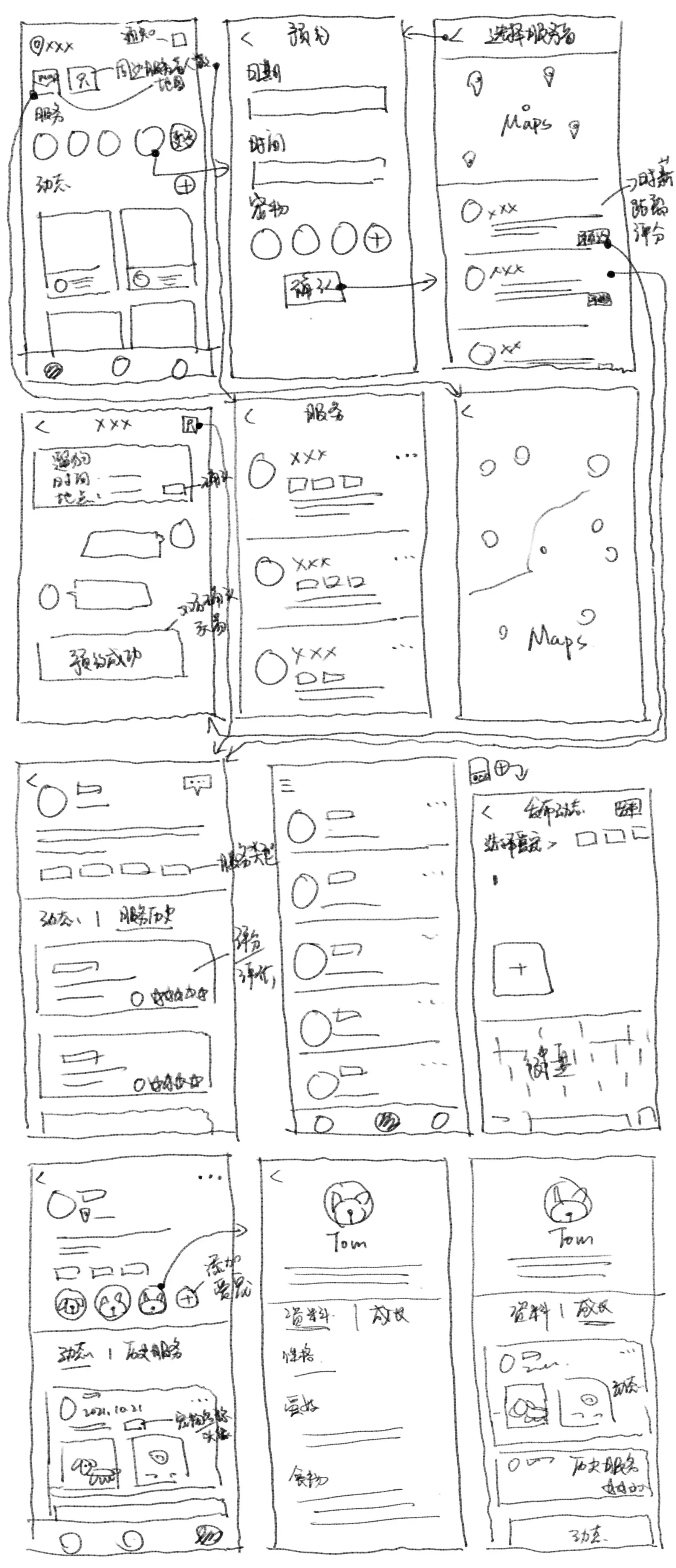 The overall design remains in harmony with the initial concept, encompassing pet service booking, pet growth records, and the pet community, all in alignment with the outline depicted in the initial sketches. However, there exists potential for refinement in the finer intricacies of each feature. Furthermore, the service transaction system is yet to attain full comprehensiveness, and the backend design for showcasing service provider offerings remains in the process of being fully developed.